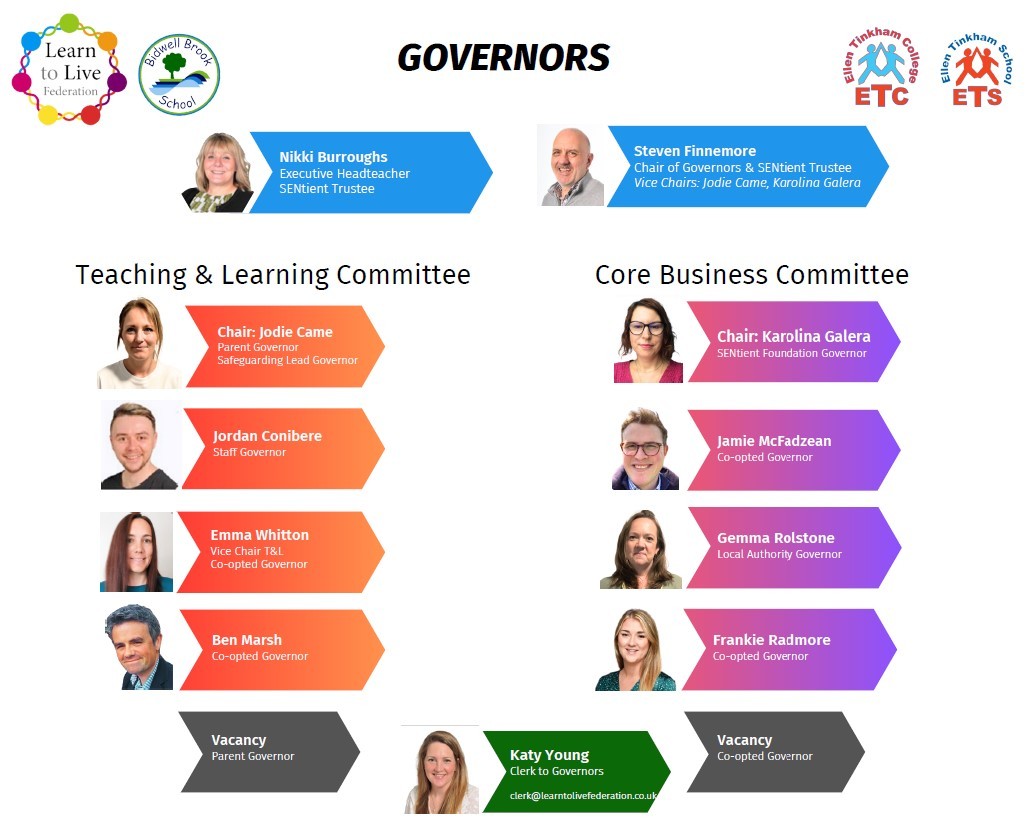 Our governors are volunteers who give up their time to oversee the development of the Learn to Live Federation. The governors work collectively as a team, responsible for overseeing both schools (Bidwell Brook School and Ellen Tinkham School) within the Federation. Some of our governors are parents and staff, whilst others may be local residents or business people.